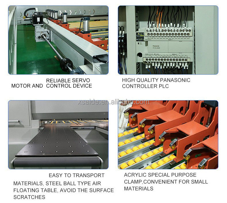 7. Prowadnica siedziska piły przyjmuje importowaną markę, prostoliniowość cięcia < 0,06 mm, z wysoką precyzją i dużym obciążeniem, serwosterowanie Panasonic jest specjalnie używane dla PMMA, MS, PS, PLEXIGLAS, AKRYL, PLASTIK.